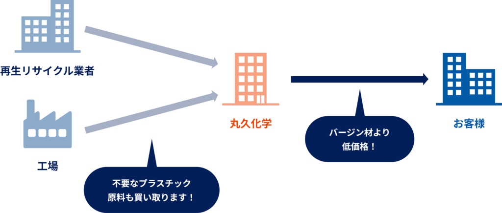 使用済みプラスチックや工程内スクラップを再生原料として加工し、バージン材よりもコストを抑えた原料と