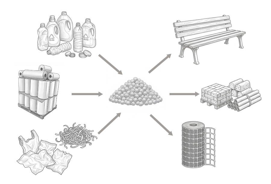 使用済みプラスチックや製造工程で発生するスクラップを再生原料として活用し、新たな製品へと生かしています。再生業者と連携し、回収からペレット化、用途別供給までを一貫して管理。公園設備や物流用パレット・建材・農業資材など幅広い分野で再利用されています。